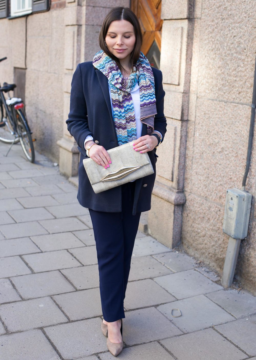 Denna fredag är navy i majoritet. För att addera lite extra färg valde jag en sjal från Missoni som går i beige, lila och turkost. Jag får alltid massor med komplimanger för min clutch från Diane von Furstenberg, pussmunnen är en rolig detalj som får en att le!