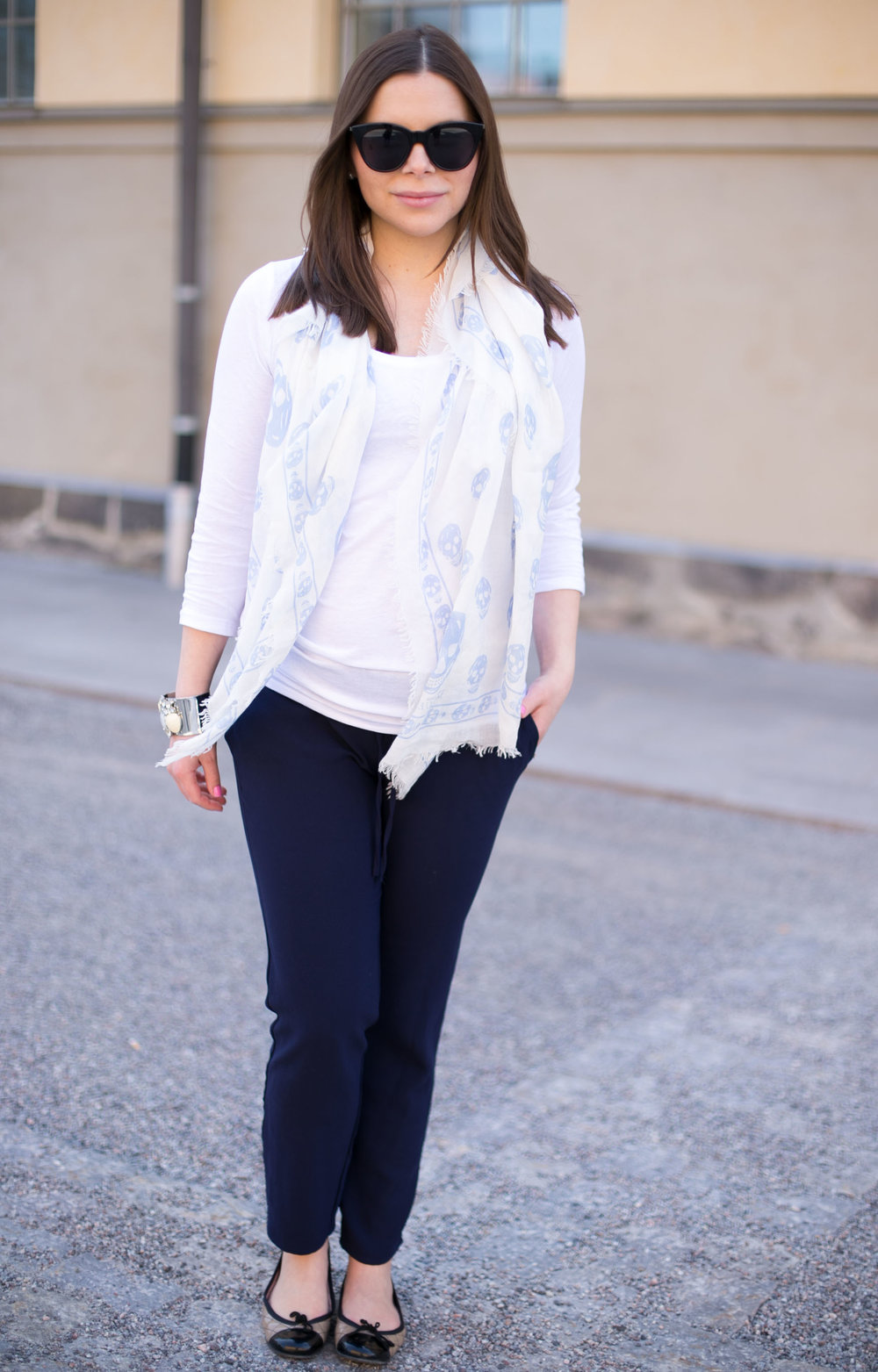 Igår promenerade jag runt i solskenet i en bekväm och basic outfit. Jag och Johan parkerade oss på KMK’s brygga med en kopp kaffe innan vi gick vidare ut på Djurgården och Rosendals trädgårdar. När jag har enkla basplagg adderar jag alltid en extra accessoar, som i det här fallet, en sjal från Alexander McQueen.