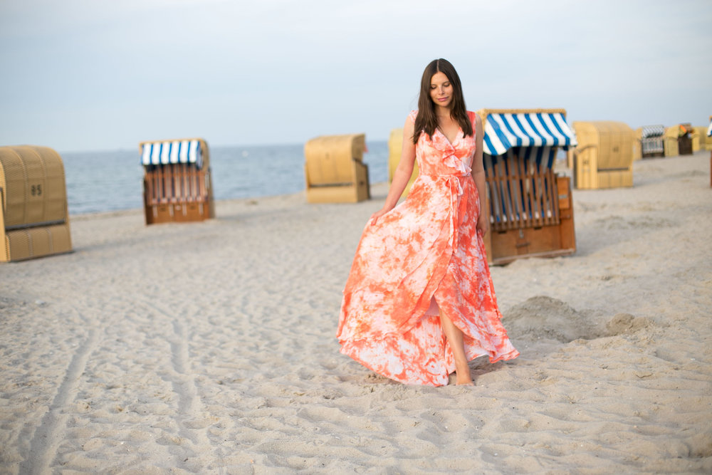 En kväll vid Timmendorfer strand hade jag på mig min mönstrade klänning från Haust. Den rör sig så fint när man går! Det är en underbar känsla att ta av sig klackarna och promenera i sanden, speciellt när solnedgången närmar sig. Jag älskar att känna sanden mellan tårna.