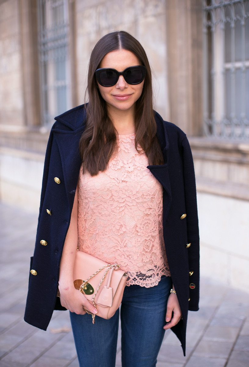 Idag kombinerar jag pudriga nyanser med navy. Jag älskar spetsen på den här blusen för den påminner om den från min bröllopsklänning! Själva nyansen är lite svår att få fram på bild men det är i en mjuk pudrig nyans av korall som går väl ihop med min väska från Mulberry.