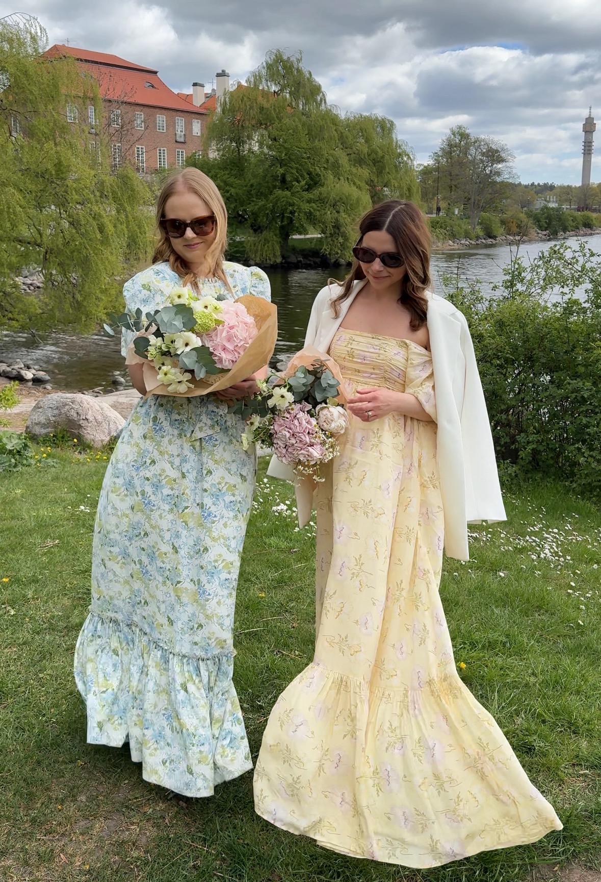 Louise klänning kommer från Love Lolina. Min blommiga klänning kommer från By Timo och kavajen från Marqet.