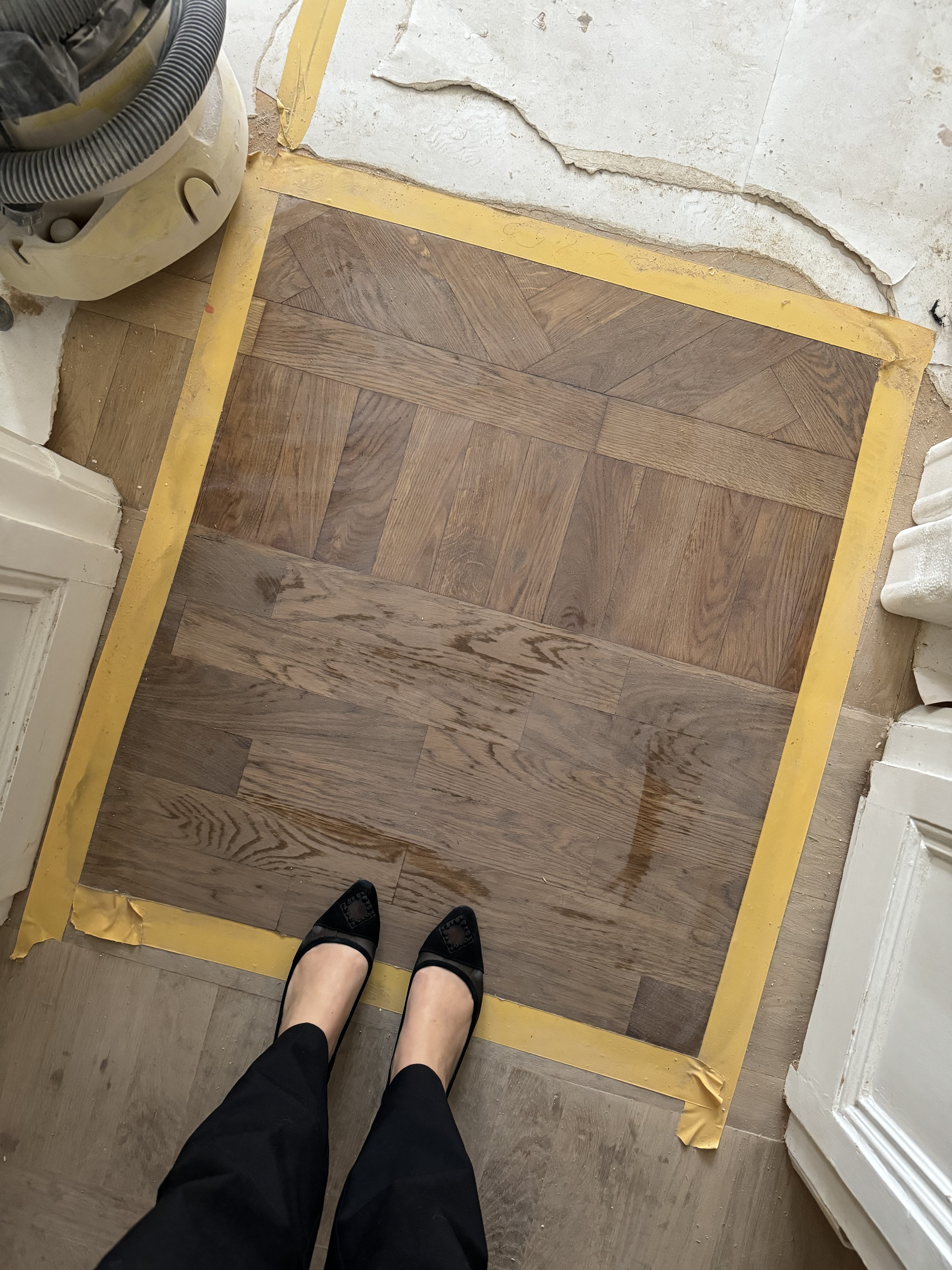Det är svårt det här med färg på parkett! Vi kommer gå lite mörkare än det här. Det viktigaste för mig är att parketten inte drar åt det gula hållet.